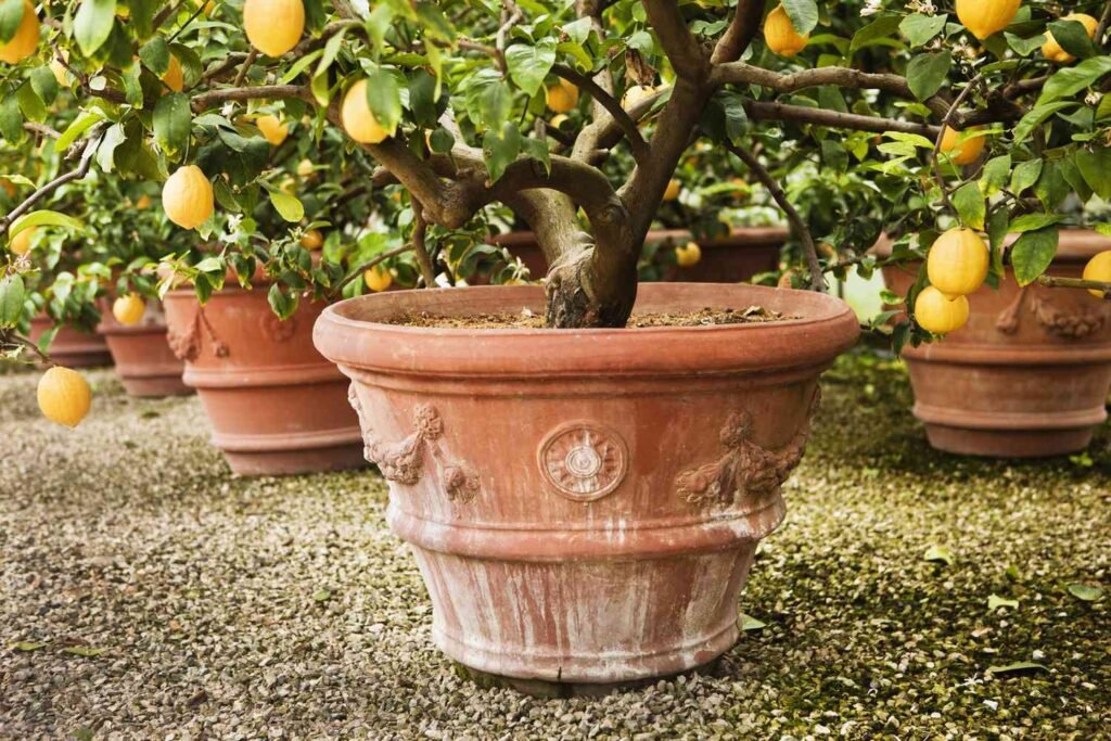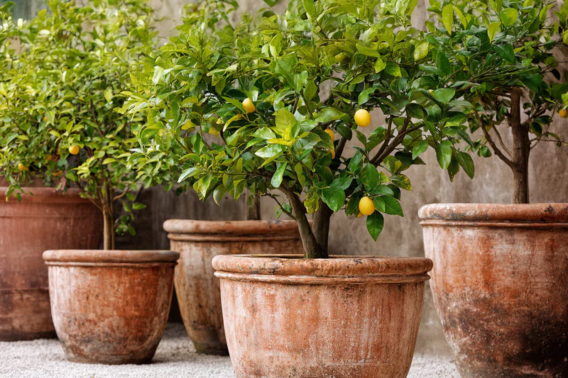 Lemon trees are classic container plants. Compact, aromatic, and producing bright yellow fruit, they are perfect for patios or sunny windowsills.