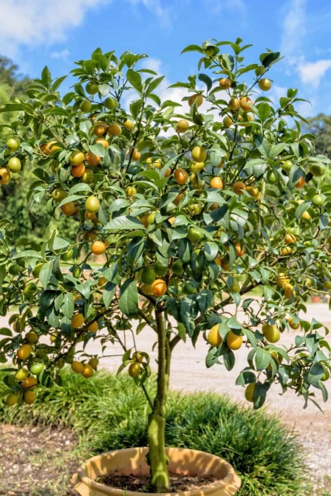 Kumquats are small citrus trees with edible peel and tart-sweet fruits. They thrive in pots and are excellent for ornamental purposes.